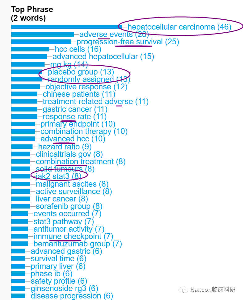 根据大数据分析的热词结果显示,秦叔逵教授所发表SCI论文的关键词集中在(晚期)肝癌、生存期、应答率、不良事件、随机安慰剂试验、联合治疗等。显示秦叔逵教授通过RCT研究探讨提高晚期肝癌患者生存期等研究,由此推动肝癌等的规范诊疗、改善预后的联合治疗等。引文分析给出了类似的结果,通过2期和3期RCT临床试验探索(晚期)肝癌更优化的治疗方案是秦叔逵教授重要论文的关键词。