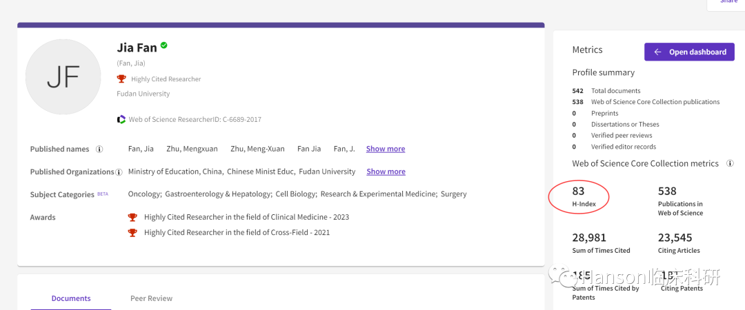 大数据分析显示,程颖教授发表论文的热词集中在肺癌、患者关注、RCT临床试验等;显示程颖教授致力于恶性肿瘤的精准化、个体化、规范化治疗,尤其是EGFR突变的肺癌的临床诊治及基础研究工作,包括肺癌的精准诊断、靶向和免疫治疗以及分子生物学研究和转化性研究。引文分析给出了类似的结果,3期临床试验、EGFR突变、肺癌、肝癌、乳腺癌等是程颖教授重要论文的关键词。Web of Science数据显示,樊嘉教授的研究论文已有28,981次引用,h指数高达83。根据大数据分析的热词结果显示,樊嘉教授所发表SCI论文的关键词显示,其研究集中在肝癌、肝移植、手术治疗、放疗、预后、复发等研究,并采用了倾向性评分、匹配等非常科学的统计方法;显示樊嘉教授主要从事肝胆肿瘤临床诊治及肝脏移植、肝癌转移复发机制及转化研究等研究。引文分析给出了类似的结果,针对晚期癌症的预后、缓解/生存率,采用手术+药物方法,并积极从癌症发生机制探索新的转化医学方法等是樊嘉教授重要论文的关键词。