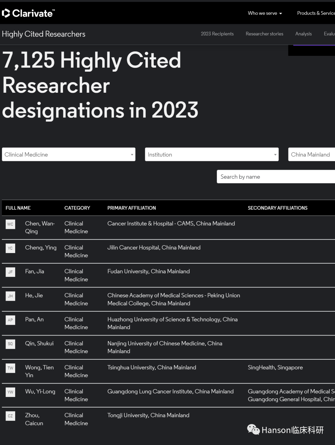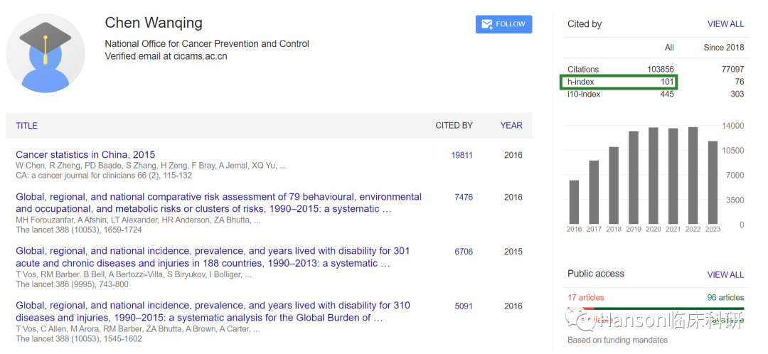 Bringing medical advances from the lab to the clinic.2023年11月15日,科睿唯安在英国伦敦发布2023年度“全球高被引科学家”名单,遴选全球高校、研究机构和商业组织中对所在研究领域具有重大和广泛影响的顶尖科学人才【1】。来自全球67个国家和地区1,300多个机构的7,125名科学家入选2023年度名单。全球高被引科学家的遴选方法论由科睿唯安科学信息研究所 (ISI™) 的文献计量学专家和数据科学家基于Web of Science™引文数据及其分析制定。美国共有2669人次入选,占总人次的37.5%;中国内地排名第二,共有1275人次入选,所占比例为17.9%。中国科学院共有270人次上榜,成为拥有全球高被引科学家人次数最多的机构;后面依次是:哈佛大学、斯坦福大学、美国国立卫生研究院、清华大学等。3,在临床医学领域,中国大陆共有9位医学科学家入选1)中国医学科学院肿瘤医院(国家癌症中心)的陈万青;1)中国医学科学院肿瘤医院(国家癌症中心)的陈万青Google Scholar显示,陈万青教授的研究论文已有103,856次引用,h指数高达101。根据大数据分析的热词结果显示,陈万青教授所发表SCI论文的关键词集中在“癌症发病率”、“癌症筛查”、“癌症危险因素”、“癌症负担”以及“癌症死亡率”等。显示陈万青教授长期从事肿瘤流行病学研究,从探索我国癌症疾病负担、调查国民癌症危险因素暴露和开展癌症筛查与早诊早治等。引文分析给出了类似的结果,癌症筛查、死亡率、生存率等是陈万青教授重要论文的关键词。