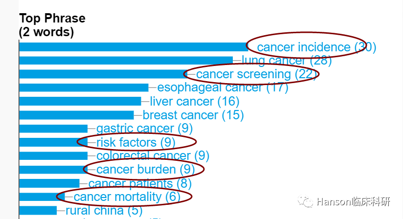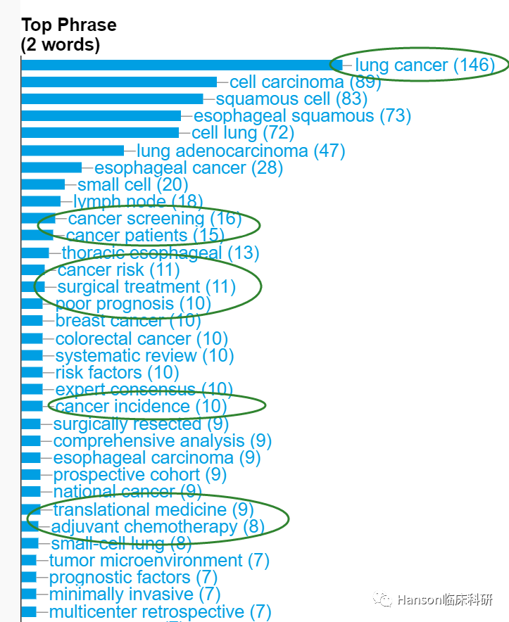 根据大数据分析的热词结果显示,赫捷教授所发表SCI论文的关键词集中在肺癌、食管癌,关注患者的癌症筛查、危险因素、发病率和预后,特别手术/新辅助治疗、转化医学等;显示赫捷教授主要开展肺癌、食管癌的分子分型与个体化诊疗的基础研究、转化医学和个体化治疗等研究等。引文分析给出了类似的结果,基于遗传学和分子标记物的癌症筛查、转化医学研究和个体化治疗等是赫捷教授重要论文的关键词。