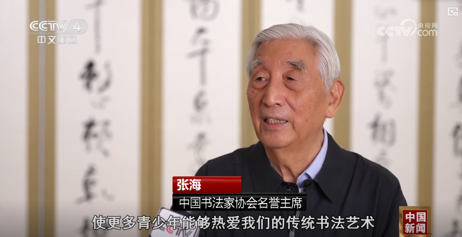 中国书法家协会名誉主席 张海:学习书法、创作书法,在欢乐中成长,在欢乐中学习,使更多青少年能够热爱我们的传统书法艺术。