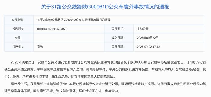 央视网消息:陕西安康市交通运输局通报,2025年9月22日,安康市公共交通安恒有限责任公司驾驶员陈耀海驾驶31路公交车陕G00061D由安康中心城区驶往恒口,于9时59分行驶至正英大道公交站,车辆偏离车道右侧车轮滑入边沟,侧倾导致车体、车外公交站牌及路灯杆受损,车载18人中13人(含驾驶员)受轻伤,其中2人骨折,所有伤者体征平稳、无生命危险,均在汉滨区第三人民医院医治。