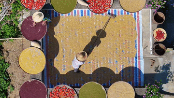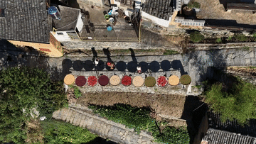 9月18日,阳产村村民在土楼前晾晒农作物(无人机照片)。