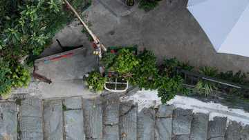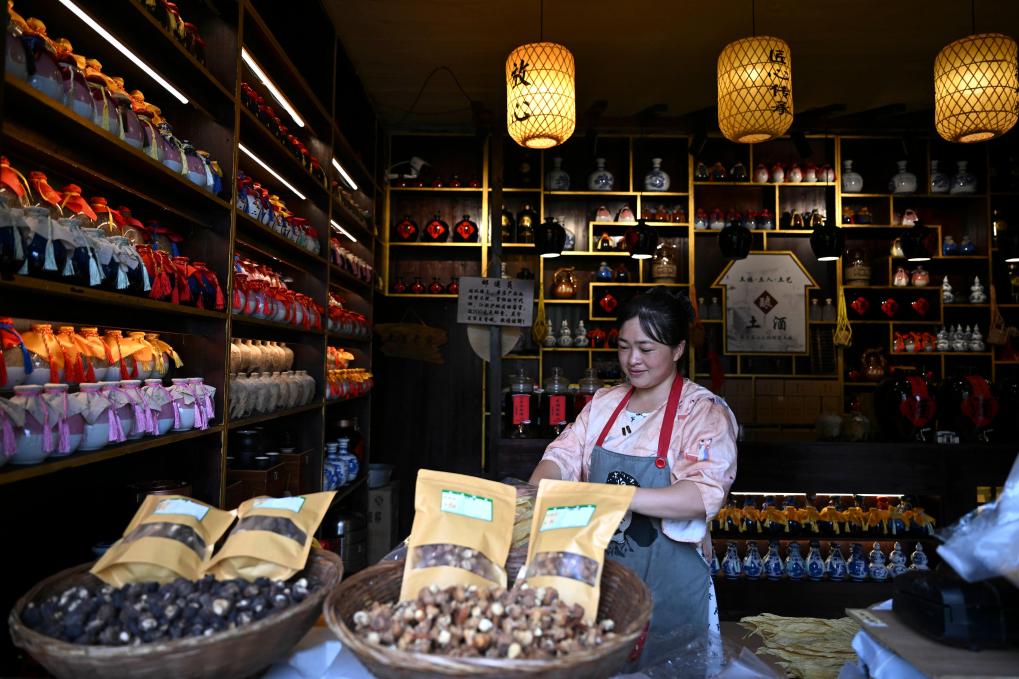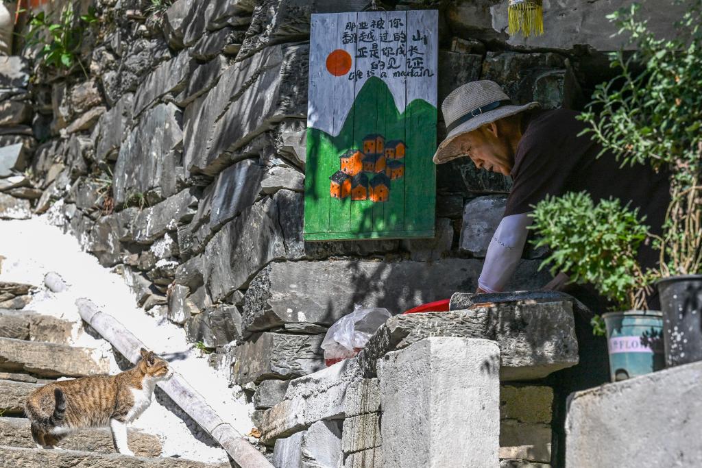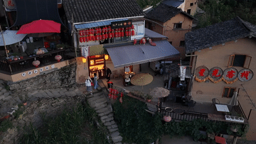 9月19日,村民挑着扁担行走在阳产村中(无人机照片)。