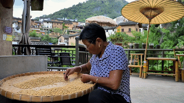 9月17日,阳产村村民在土楼前晾晒农作物。