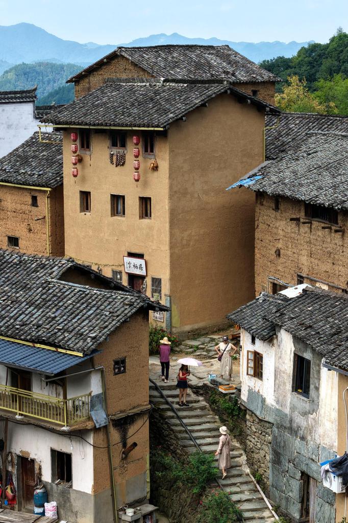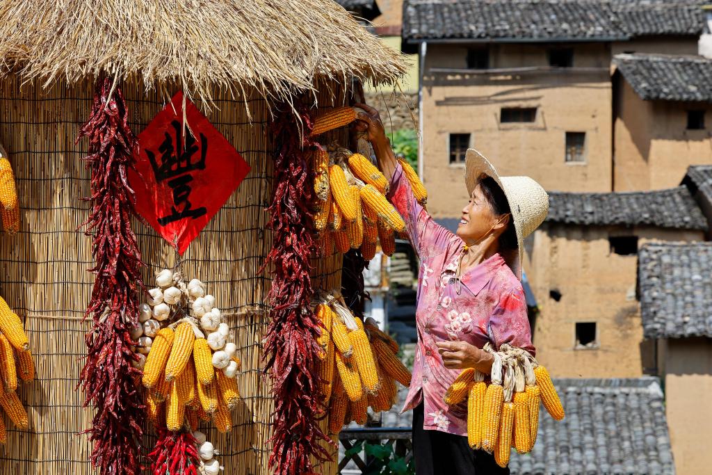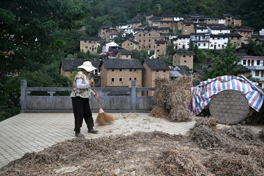 9月17日,安徽省黄山市歙县深渡镇阳产村村民在土楼前晾晒农作物。
