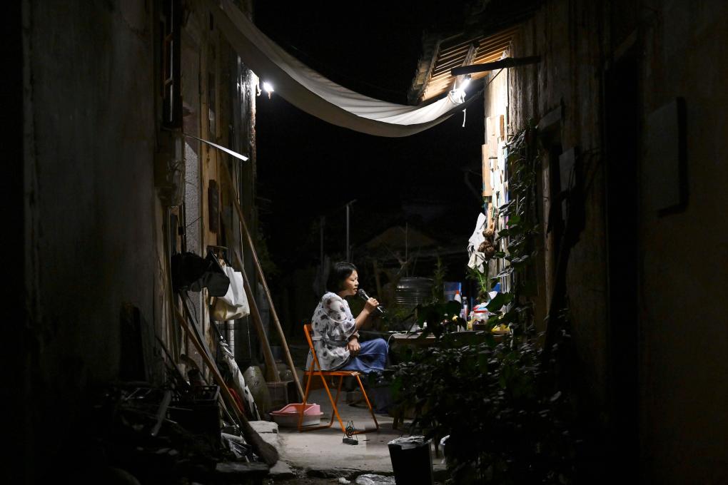 9月18日,阳产村村民吃完晚饭后对着手机唱歌休闲。