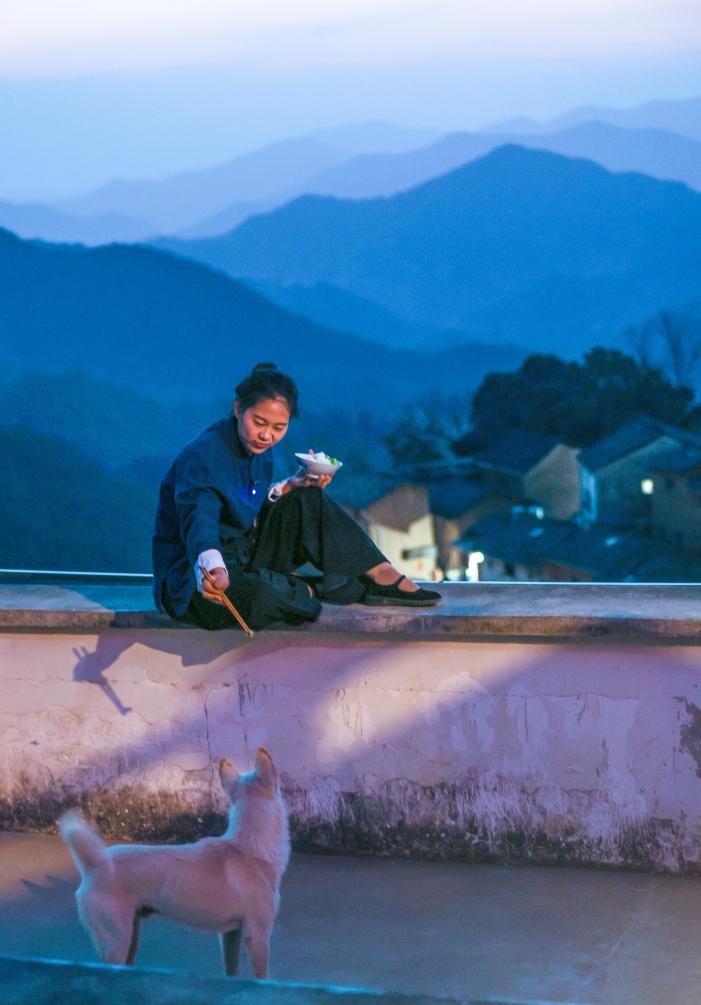 阳产村村民吃晚饭时与小狗互动(2023年11月29日摄)。