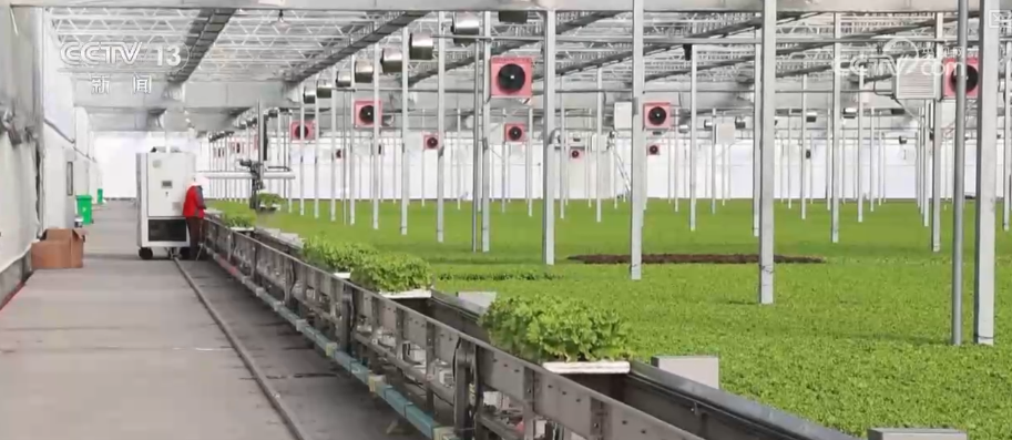 在兰陵县的这个智能连栋温室里,种植了2万平方米的生菜。成熟后的生菜通过温室内的自动传送系统送到加工车间,这里只需要5个工人就可以完成生菜挑选、打包等工作。