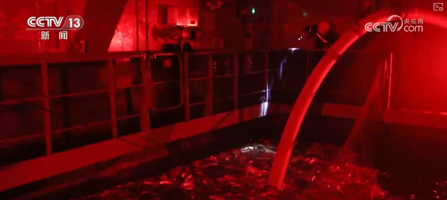 在捕捞现场,为了保持大黄鱼的外表颜色,即使在白天养殖舱内也一片漆黑。工作人员仅依靠发出红光的照明灯逐步收拢渔网,并通过吸鱼泵将大黄鱼运输到上层甲板进行冰鲜后装箱处理。