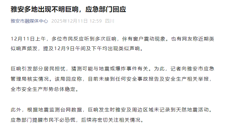 ·四川雅安多位市民称听到多次巨响,应急部门回应:未接到任何安全事故报告。