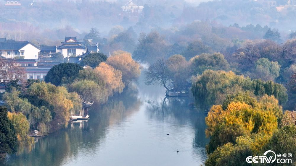 近日,江苏扬州瘦西湖风景区出现冬雾天气,五彩斑斓的树木与亭台轩榭笼罩在薄雾中,若隐若现,犹如水墨画卷。