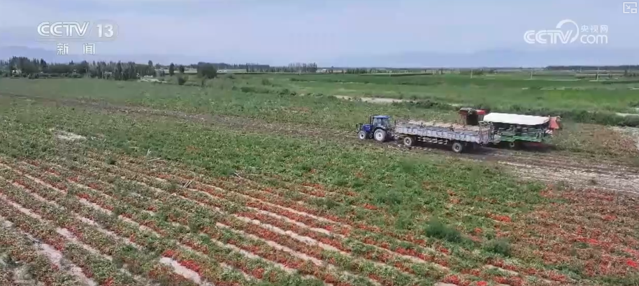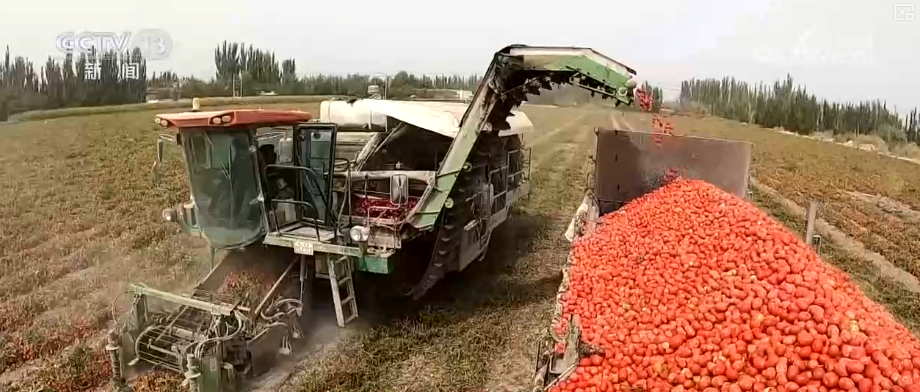 9月,正是番茄采收旺季。记者来到新疆焉耆县,近8万亩番茄地像是铺上巨幅红毯,现场机声隆隆,一派丰收景象。