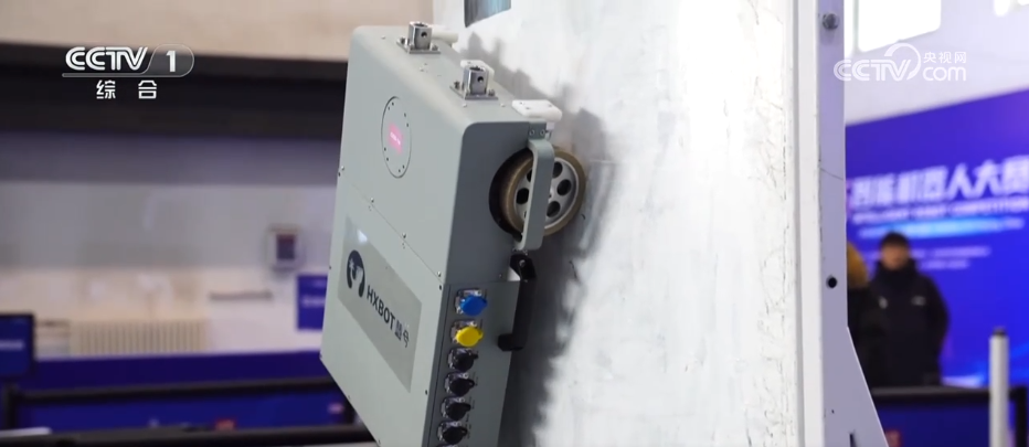 类似这样的机器人现场还有很多,它们能够在“人不能近、人不能及”的极端场景中独立发挥作用。在高空运维展示区,一台机器人正牢牢吸附在巨大的弧形风电塔筒模型上,进行高精度喷涂作业。这模拟的正是风力发电机维护中最高危的环节之一。在模拟的超高压输电线路上方,一台地线除冰机器人正在演示覆冰导线上作业,启动除冰程序。