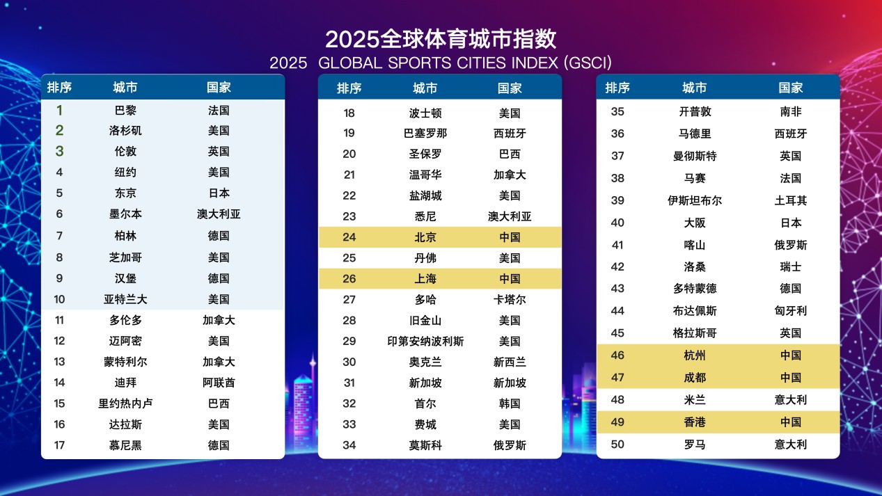 全球榜单中,法国巴黎凭借2024年奥运会的成功举办,从2024年第4位跃升至全球第1位,洛杉矶、伦敦、纽约、东京分列2—5位,头部城市格局保持稳定。区域分布呈现“欧美主导、亚洲追赶”的鲜明特征。刘东锋教授补充道:“中国城市的表现尤为亮眼,北京(第24位)、上海(第26位)、杭州(第46位)、成都(第47位)、香港(第49位)五城成功入围全球50强,较往年排名稳步提升,这表明中国城市在赛事运营、体育产业生态构建、公共体育服务等方面的综合实力,已获得国际社会的广泛认可。”