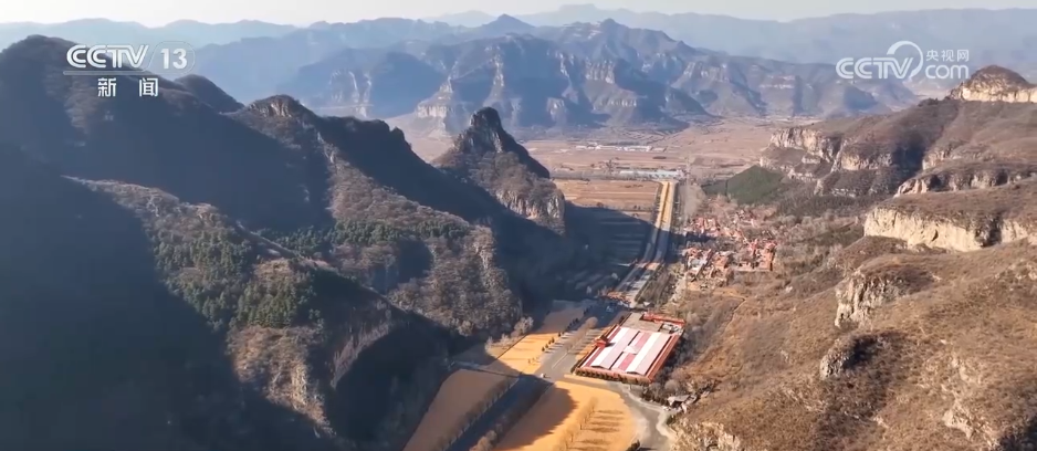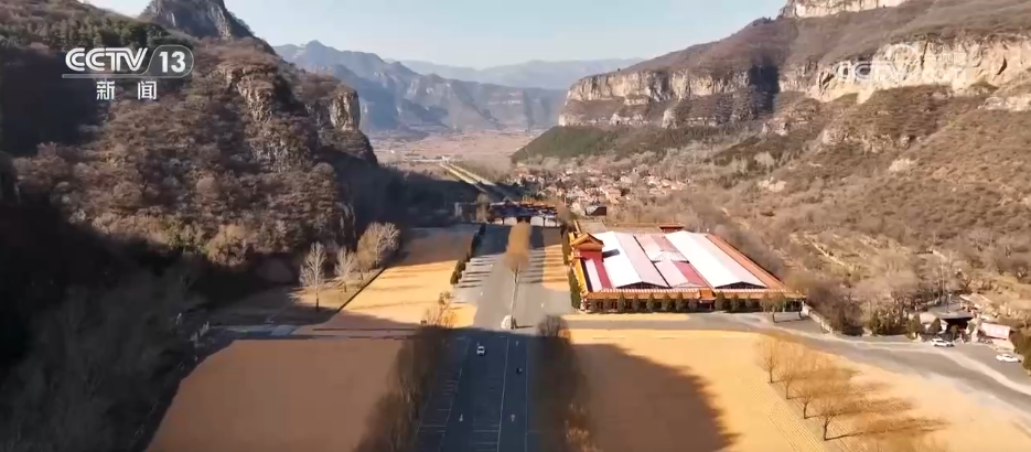 从空中俯瞰,景区内主干道路的两旁,成片的玉米已摊平铺开,在阳光下拼成了金黄色的丰收图景。