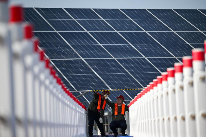 7月10日,在国家能源集团天津龙源新能源有限公司渤化光伏电站,工作人员在检查光伏发电板。新华社记者 赵子硕 摄