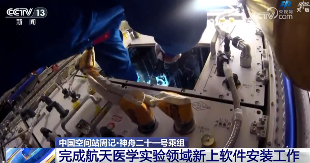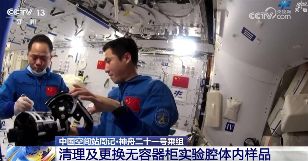 此外,乘组完成了航天医学实验领域新上软件安装工作。在微重力物理科学领域,乘组按计划完成了两相系统实验柜高速图像存储器更换、实验模块拆装等工作。此外,根据实验安排,乘组对无容器柜实验腔体内样品进行了清理及更换,并开展轴心机构电极维护、视窗盖镜片清洁等工作。