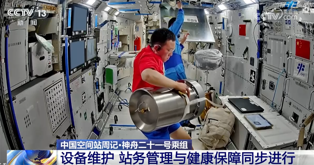 在设备检查维护方面,乘组开展了低温存储装置及零下80℃空间冰箱巡视、环控气瓶压力检查、再生生保系统设备维护等工作。在站务管理方面,乘组开展了物资整理、舱内环境清洁等工作,持续守护太空家园的干净整洁。