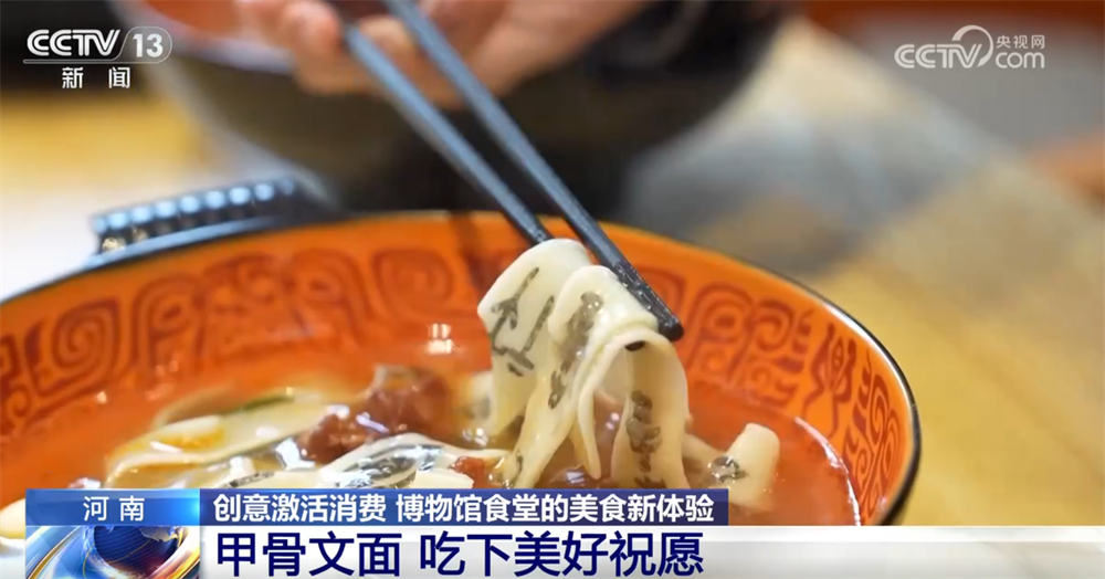 而在河南安阳殷墟博物馆,用餐高峰,一楼的子飨餐厅座无虚席,热气腾腾的“甲骨文面”端上桌,立刻成为游客镜头下的焦点。