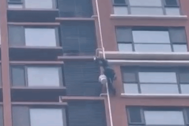 视频显示,一名被安全绳吊挂在27楼的工人将废弃的水管从楼体外侧拆除后,直接扔向了地面。由于楼层过高,水管下坠的过程中,受气流影响位置飘忽不定,几秒钟后重重砸在绿化带上,而掉落地点与行人通道仅10厘米,非常危险。